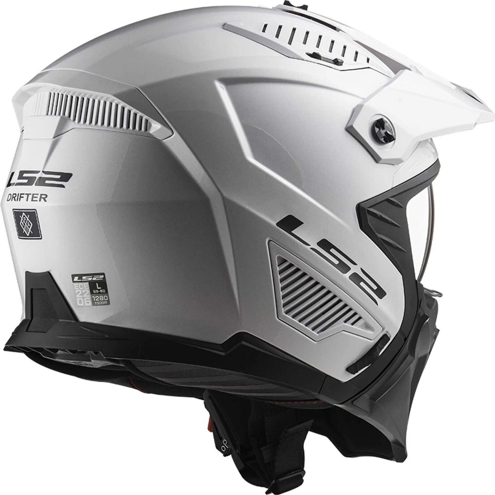 Модель 606 DRIFTER - это новый реактивный самолет LS2, оснащенный новой омологацией ECE 22.06 и отличающийся съемной защитой подбородка из термопластика. Разработанный в KPA и отличающийся современным дизайном, он имеет мягкую обивку внутри и убирающийся прозрачный солнцезащитный козырек. Он оснащен системой вентиляции с двумя большими воздухозаборниками в верхней части, а защита подбородка имеет отверстия для оптимизации циркуляции внутренних потоков.