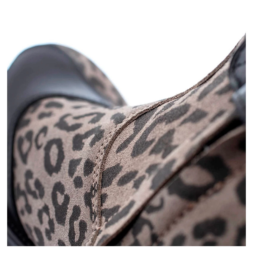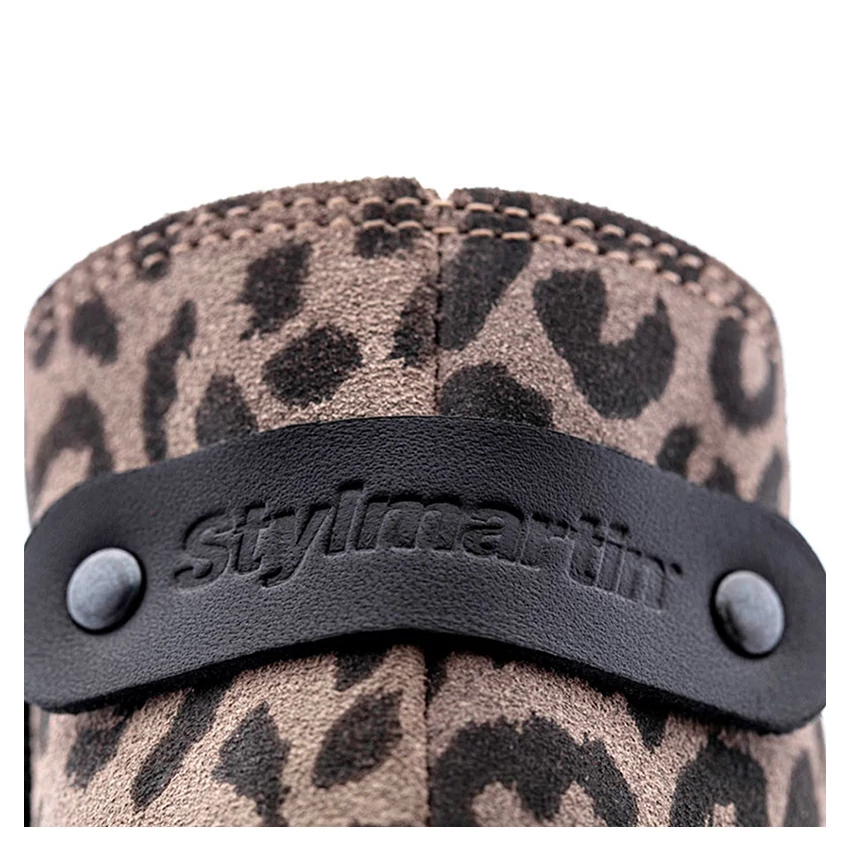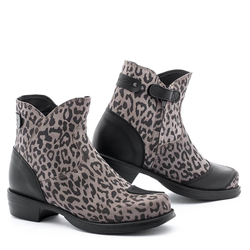 Водоотталкивающий кожаный верх со вставками из натуральной кожи почти полностью покрыт леопардовым принтом. Это создает винтажный и изысканный образ для самых смелых райдеров. Внутренняя защита из полиуретана с обеих сторон и подошва из маслостойкой антистатической резины.